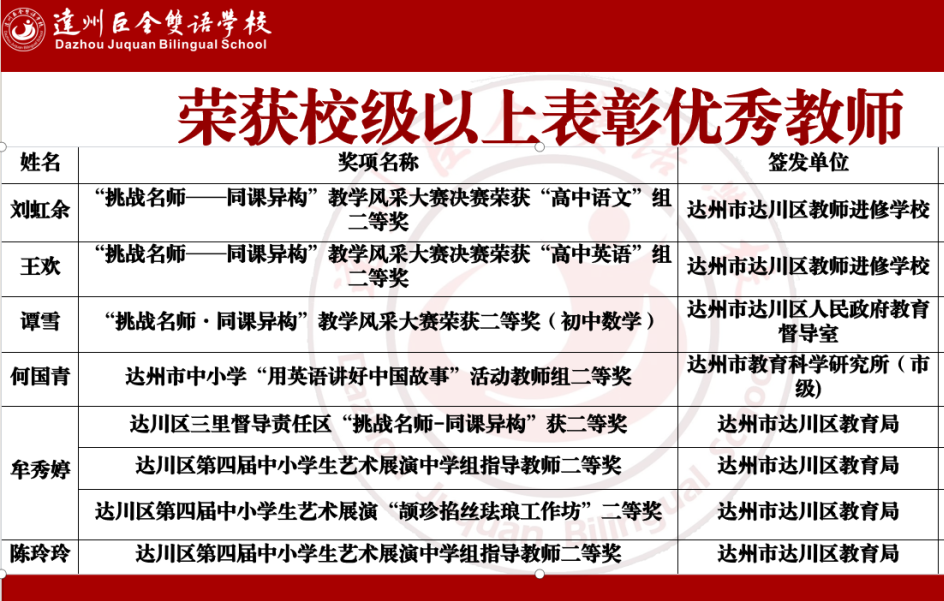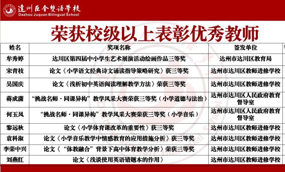 又是一年佳节至,金秋硕果挂满枝。9月7日上午,达州巨全双语学校举办教师节庆祝表彰大会。大会回顾总结了学校2024年春季各方面工作,表彰奖励了学校教育工作中涌现出来的先进个人,切实营造尊师重教的浓厚氛围,激励全体教师进一步增强责任感和使命感,开拓创新、勇争一流,为学校高质量发展做出积极贡献。