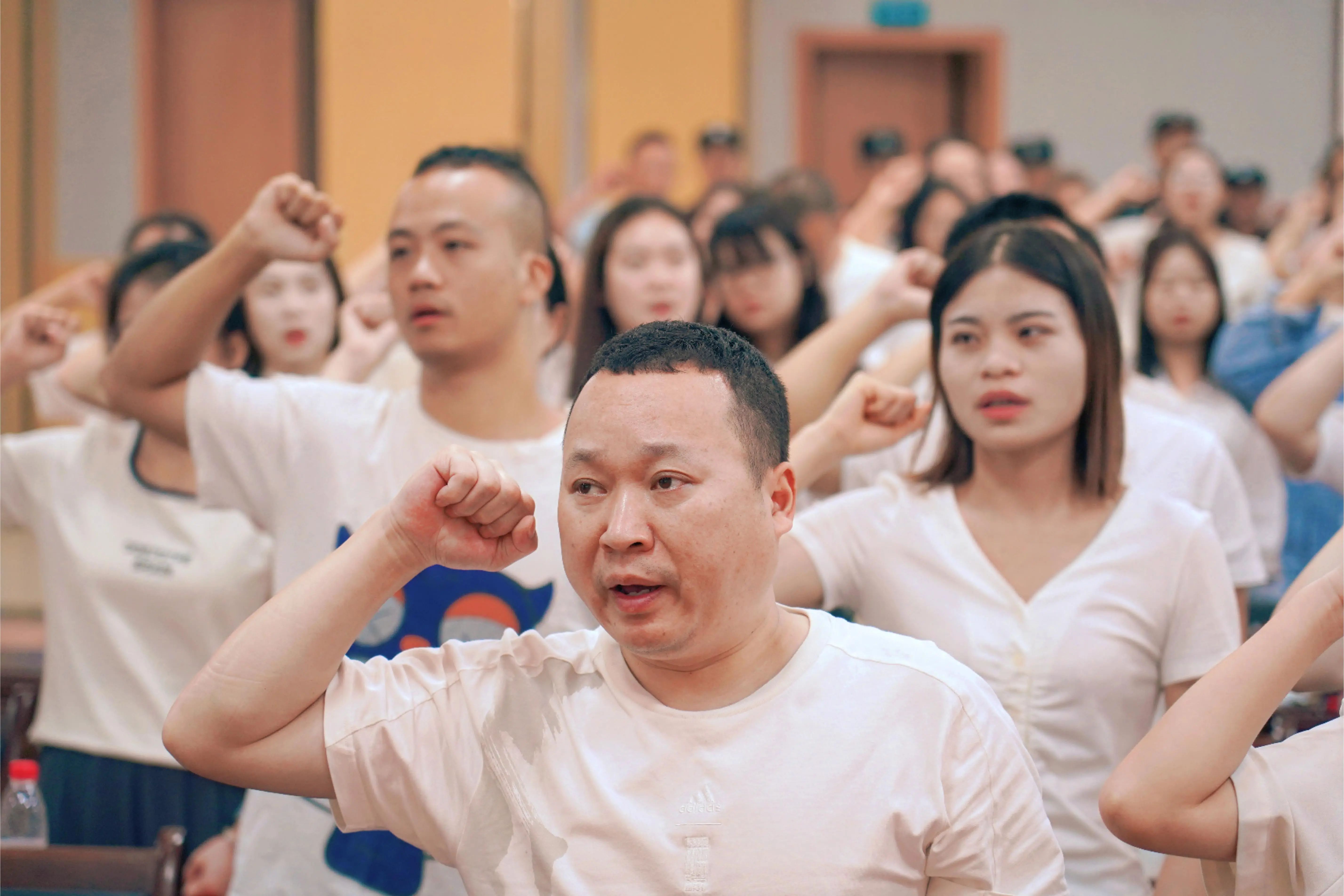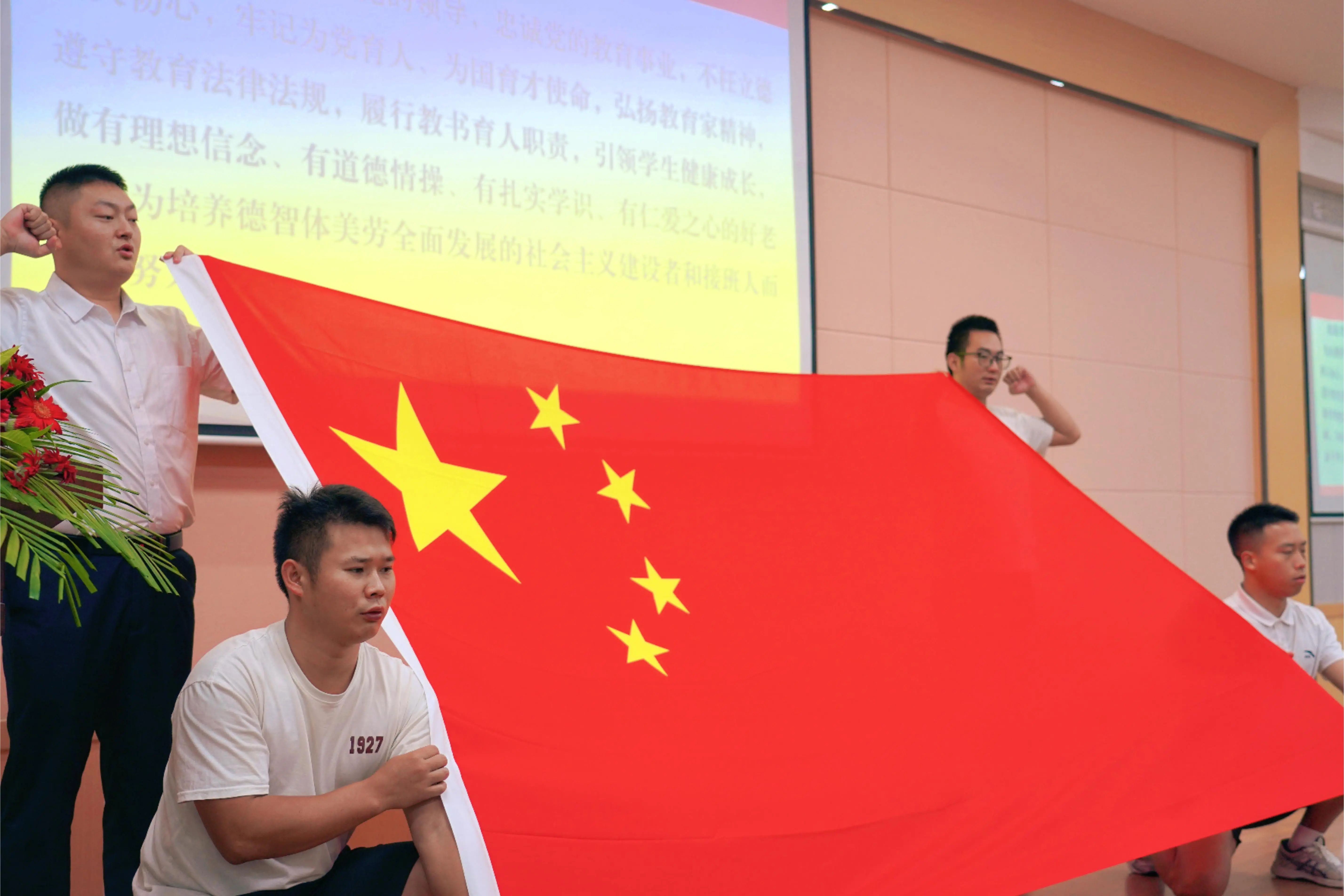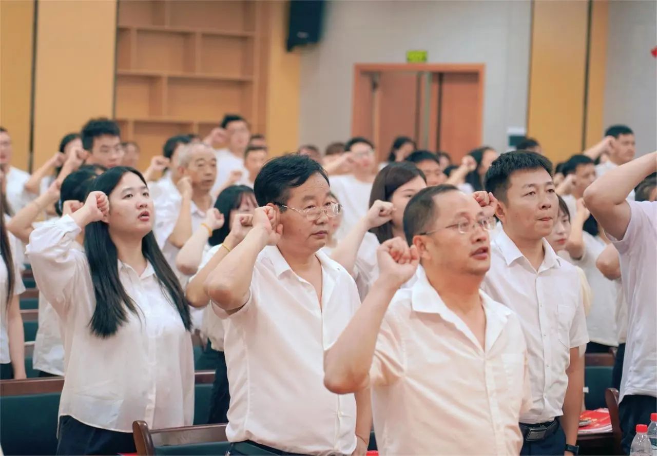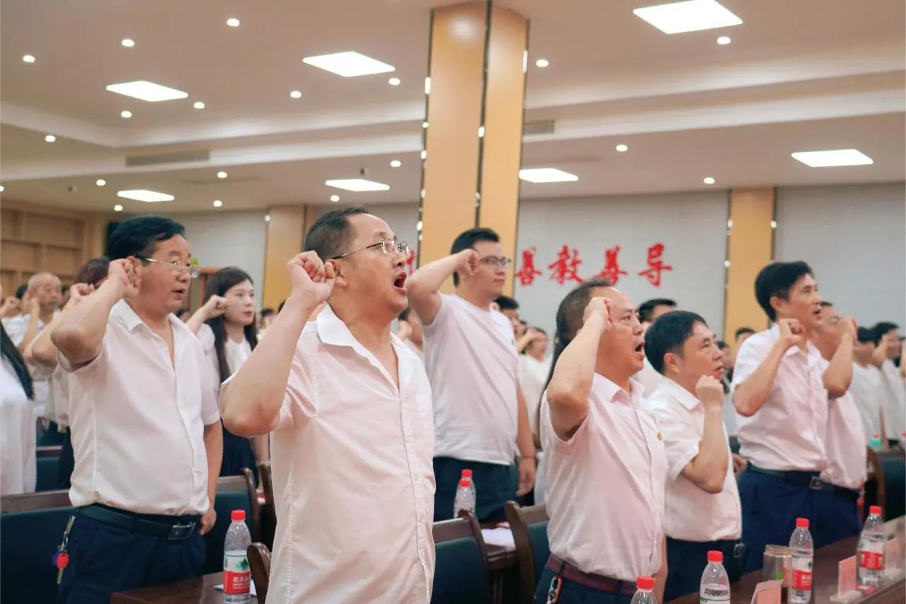 在庄严的宣誓声中,全体教师高举右拳郑重承诺,忠诚党的教育事业,贯彻党和国家的教育方针,遵守教育法律法规,恪守教师职业道德,履行教书育人职责,争当有理想信念、有道德情操、有扎实学识、有仁爱之心的人民教师,为实现中华民族伟大复兴的中国梦而努力奋斗!